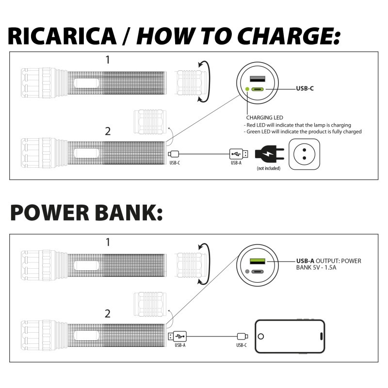La torche est équipée de deux batteries lithium-ion 21700 de 4000 mAh chacune, offrant jusqu’à 120 heures d’autonomie en mode 10 lumens. La fonction power bank intégrée permet de recharger vos appareils mobiles en déplacement, grâce au câble USB fourni de 50 cm. Le tout est contrôlé par un interrupteur simple d’utilisation, et la torche est livrée prête à l’emploi avec ses batteries incluses.