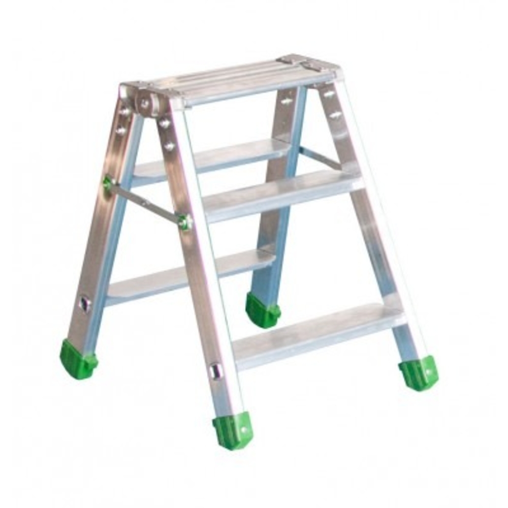 Marchepied en aluminium à double accès et 3 marches, conçu pour des travaux occasionnels à faible hauteur. Sa structure en aluminium le rend léger et pliable, facilitant son transport et son stockage. Il est construit pour résister à des usages intensifs avec des montants de 24 × 60 × 1,6 mm, offrant une durabilité accrue. Les finitions sont de haute qualité, avec des compas en acier prévenant la fermeture ou l'écartement accidentels et des patins en caoutchouc non marquants pour une meilleure stabilité. Les marches ont une profondeur confortable de 85 mm, et l'ensemble supporte une charge maximale de 150 kg. Dimensions: 550 x 410 x 570 mm; hauteur d'accès de 2570 mm.