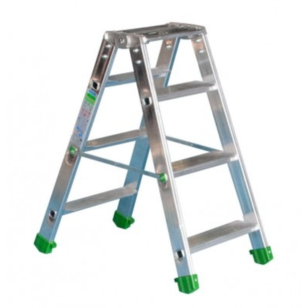 Escabeau en aluminium à double accès de 4 marches, conçu pour des tâches occasionnelles en hauteur modérée. Sa structure en alu avec montants de dimensions 24x60 mm et épaisseur de 1,6 mm assure une solidité pour un usage intensif. Les marches, d'une profondeur de 85 mm, facilitent l'accès des deux côtés. Sécurisé par des compas en acier empêchant tout écartement ou fermeture accidentelle, et équipé de patins en caoutchouc pour une stabilité optimale. Charge maximale supportée : 150 kg. Dimensions : 720x440x800 mm, plié : 440x170x870 mm, hauteur d'accès : 2800 mm.
