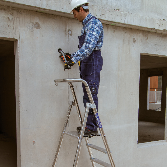 Le Probat est un marchepied en aluminium destiné à usage ultra-intensif. Il répond à la norme EN 131 et au décret 96 333 et est labellisé NF. Ses montants de 50 mm, ses marches de 10 cm avec système anti-rotation breveté, sa plate-forme renforcée en aluminium font de lui le marchepied aluminium le plus résistant du marché. La preuve en est, il est testé pour résister à des charges pouvant aller jusqu’à 150 kg. Disponible de 4 à 12 marches, il permet d’accéder en toute sécurité à une hauteur maximum de 4,84 m sur une plate-forme de 390 x 382 mm. Il dispose d’un crochet porte-seau et d'une tablette porte-outils.