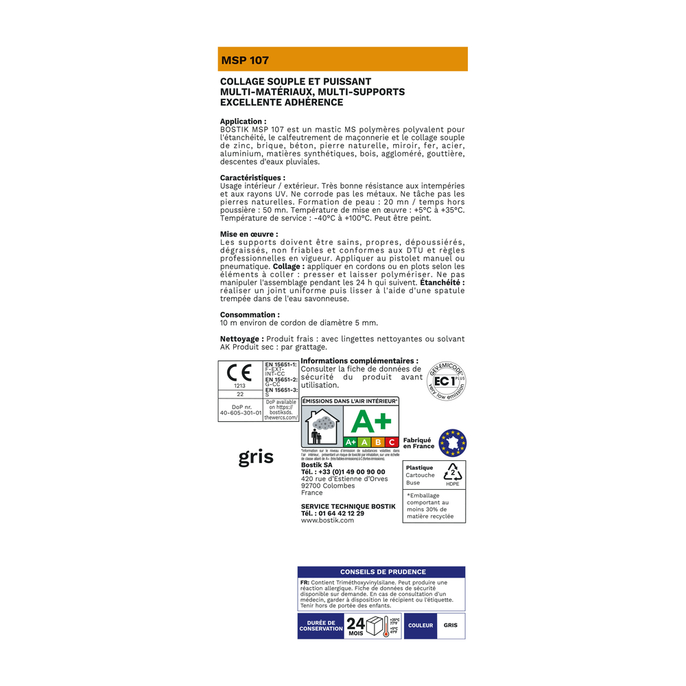 Découvrez Mastic d'étanchéité et fixation MSP 107 Gris 290 ml - Lot de 12 - BOSTIK - 30131383 disponible à l'achat