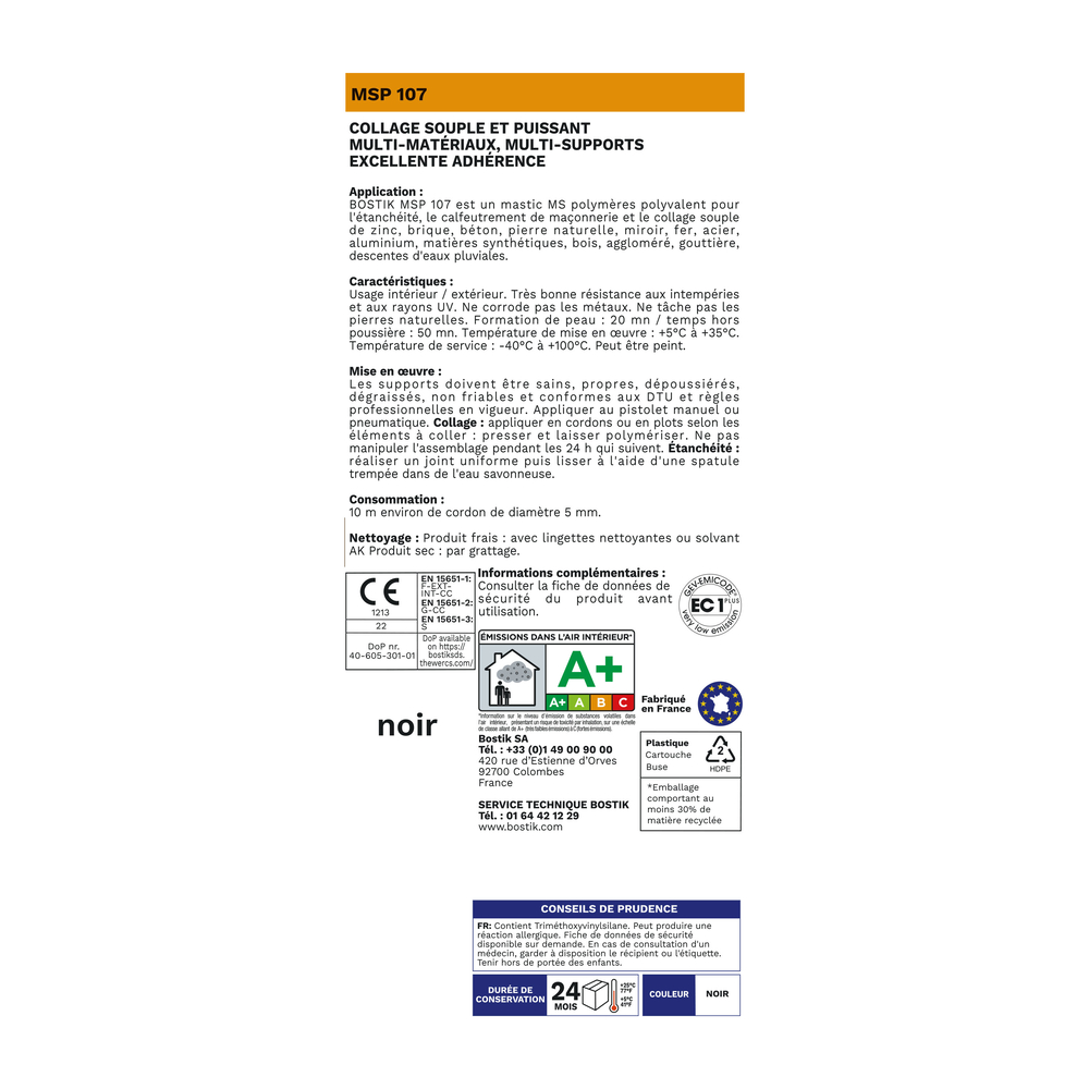 Le mastic d'étanchéité et de fixation MSP 107 Noir de BOSTIK est idéal pour des applications intérieures et extérieures, offrant fiabilité et performance.