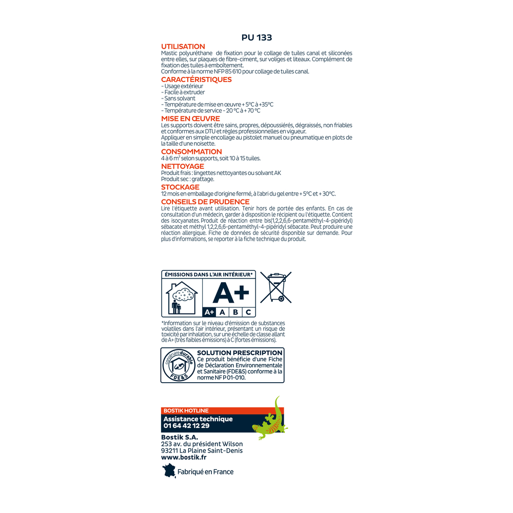 - Type de produit : Mastic de collage spécial tuiles PU 133