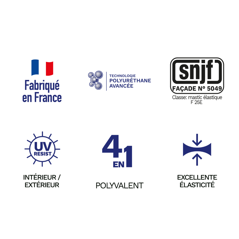 Avec un excellent confort d’utilisation pendant l’extrusion et le lissage, sa formule assure une adhérence remarquable sans nécessiter de primaire sur divers supports tels que béton, maçonnerie, aluminium, bois, verre, et PVC. Complètement inoffensif, ce produit ne comporte aucun pictogramme de danger et peut être peint pour s'intégrer parfaitement à votre décor.