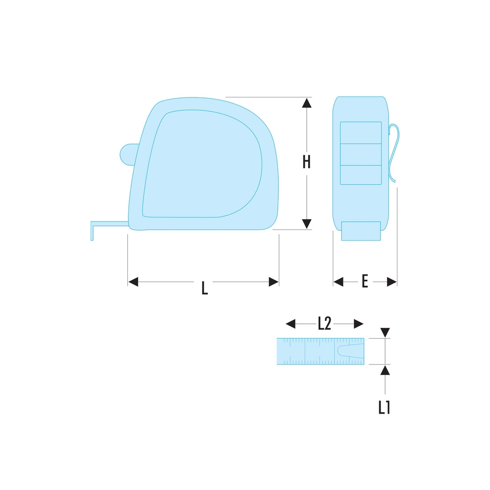 Ce mètre à ruban affiche des mesures métriques de 5 m x 19 mm, avec un ruban en nylon anti-reflet mat pour une lisibilité optimale. Sa bande haute résistance assure une durabilité accrue, tandis que le crochet de couverture haute résistance, avec 2 rivets et plaque inox sur les 3 m et 3 rivets sur les 8 m, garantit une utilisation prolongée. Pour des mesures intérieures, une cote L peut être ajoutée, facilitant ainsi divers calculs.