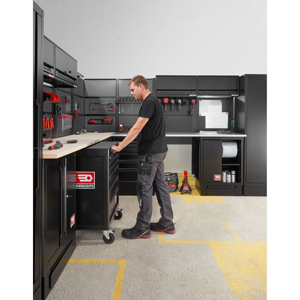 Adapté au système d'atelier Roll Workshop System, ce meuble est idéal pour le rangement organisé de vos outils. Doté de tiroirs à ouverture totale, il assure un accès facile grâce à des glissières télescopiques à billes. Pendant le transport, les poignées en polypropylène avec crochets de sécurité empêchent toute ouverture accidentelle des tiroirs. Le meuble est conçu pour accueillir divers modules de rangement, optimisant ainsi l'espace en fonction de vos besoins.