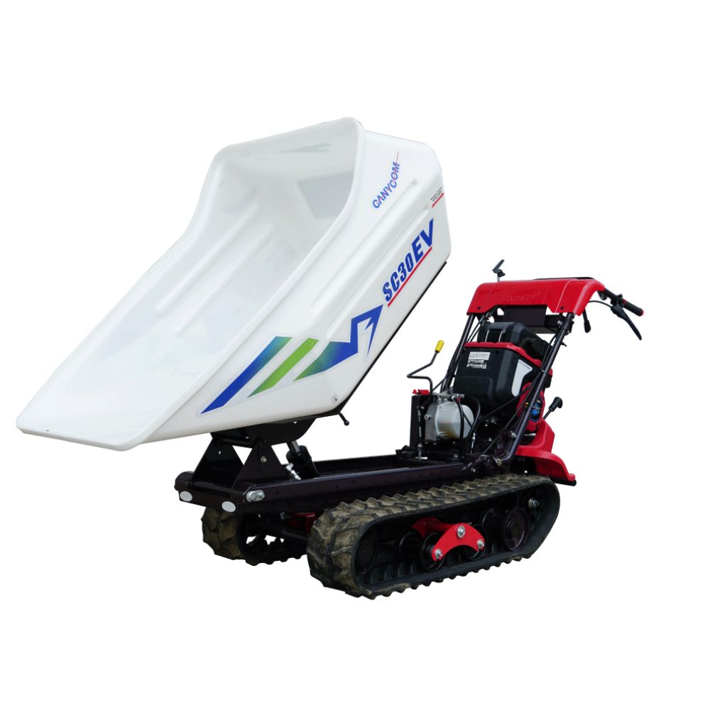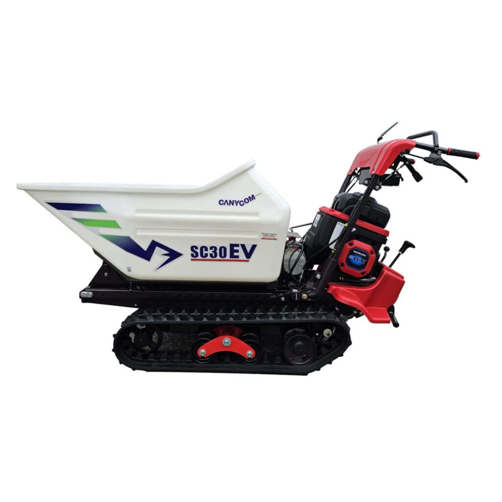 La benne bénéficie d’un angle de déversement hydraulique de 90°. Le transporteur se déplace sur des chenilles larges de 180 mm, avec quatre vitesses avant et deux vitesses arrière, atteignant une vitesse maximale de 3,3 km/h en avant et 2,5 km/h en marche arrière. Il peut franchir des pentes jusqu’à 26° à vide. Les dimensions extérieures du SC 30EV sont de 2140 mm de longueur (2045 mm en position manette haute), 740 mm de largeur et 1055 mm de hauteur (1150 mm en position manette haute). Le temps de travail continu est d’environ 50 minutes, avec un temps de charge rapide à 80 % en 60 minutes et une charge complète en 90 minutes, variable selon les conditions d’utilisation.