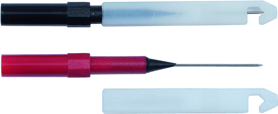Ces pointes de contrôle sont pratiques pour le test de circuits où aucun contact ouvert n'est disponible. Elles se fixent facilement grâce au raccord pour fiche banane de 4 mm. La pointe en forme d'aiguille en acier à ressort, d'un diamètre de 0,7 mm, permet une utilisation précise, même à partir du dos du câble.