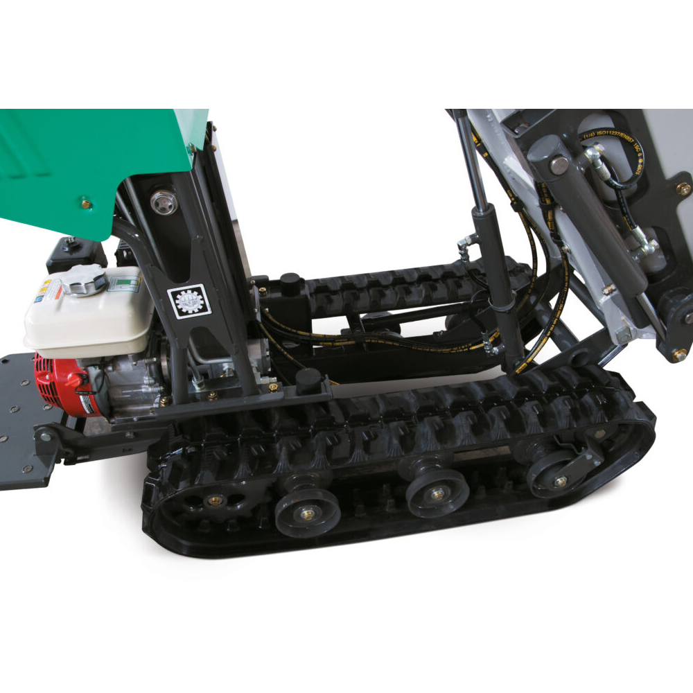 Cette machine est équipée d’un moteur essence HONDA GX 200 développant une puissance de 4,7 kW (6,5 chevaux) avec un régime moteur de 3 600 tours par minute. Le démarrage est manuel. Le système de traction est hydrostatique, doté de deux moteurs indépendants pour les chenilles, offrant une excellente adhérence et stabilité grâce à des chenilles larges de 180 mm et longues de 1 141 mm.