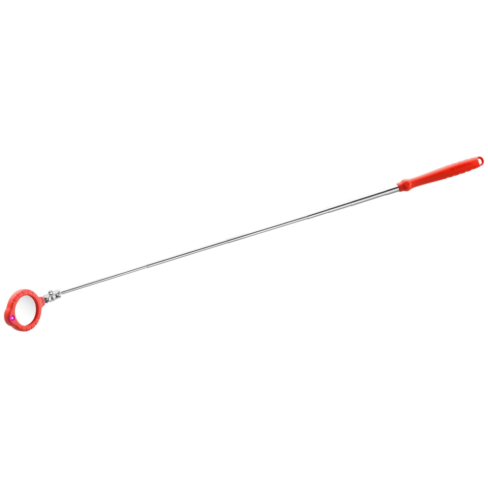 Ce miroir possède une longueur maximale de 935 mm et peut être facilement ajusté grâce à son articulation réglable, qui se bloque par vis pour un maintien sécurisé. Il est recommandé d'utiliser ce miroir dans des zones sombres pour tirer pleinement avantage de son rétroéclairage par LED, améliorant ainsi la visibilité lors de vos interventions.
