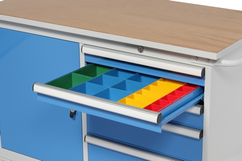 Couleur : structure Gris RAL7035/tiroirs, porte et plateau : Bleu RAL5015