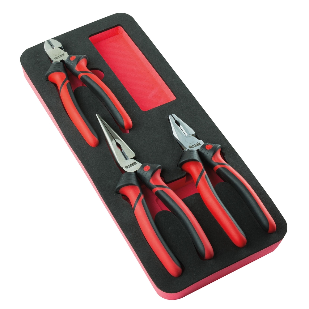 1 universelle 18 mm // 1 coupante diagonale 16 mm // 1 becs demi-ronds 2 mm. Dans module mousse bicolore 385 x 165 mm. Chaque outil a une place définie. Les outils manquants se repèrent en quelques secondes grâce au fond rouge. Mousse bi-colore haute densité, ne casse pas, ne retient pas l'humidité et résiste aux produits de l'atelier.