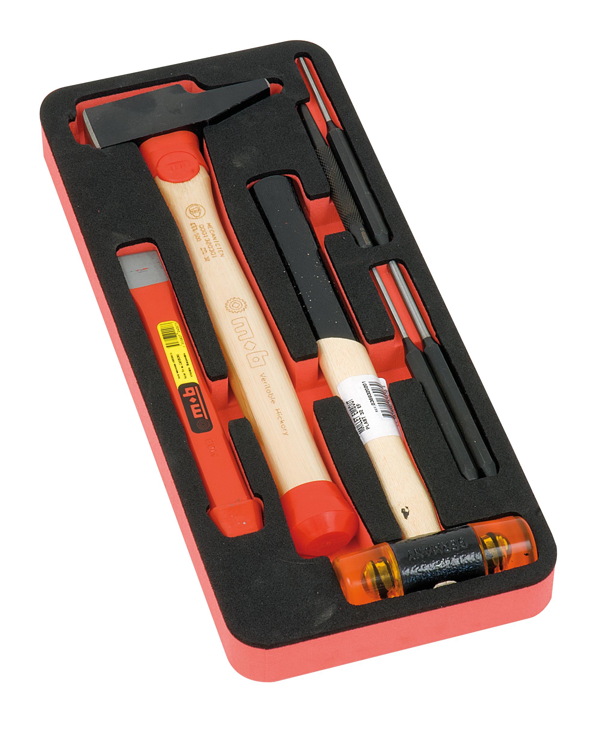 1 rivoir de 32 hickory / 1 maillet à embouts plastique 32 / 1 burin de mécanicien 2 / 1 pointeau corps moleté 6 / 3 chasse goupilles de 4, 5 et 6. Dans module mousse bicolore 385 x 165 mm. Mousse bi-colore haute densité, ne casse pas, ne retient pas l'humidité et résiste aux produits de l'atelier. Chaque outil a une place propre. Inventaire des outils manquants en quelques secondes.