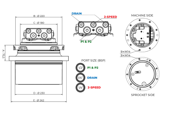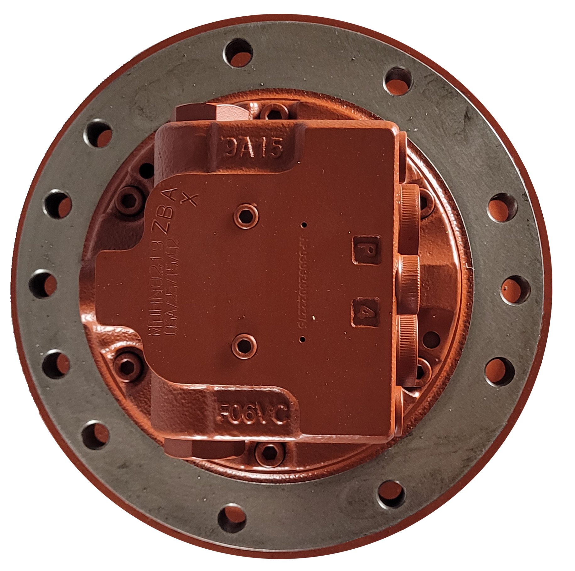 Motoréducteur MECATRA de qualité OEM conçu pour mini-pelles de 5 à 6 tonnes. Ce motoréducteur se monte facilement grâce à ses 9 trous de boulons du côté châssis machine et 9 trous de boulons du côté barbotin. Le diamètre intérieur du barbotin est de 230 mm.