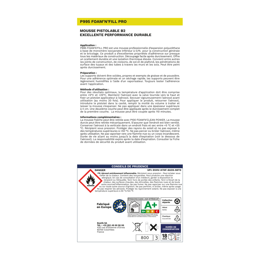 Mousse polyuréthane pistolable FOAM'N'FILL PRO P995 - Blanc 750ml - Lot de 12 - BOSTIK - 30623789