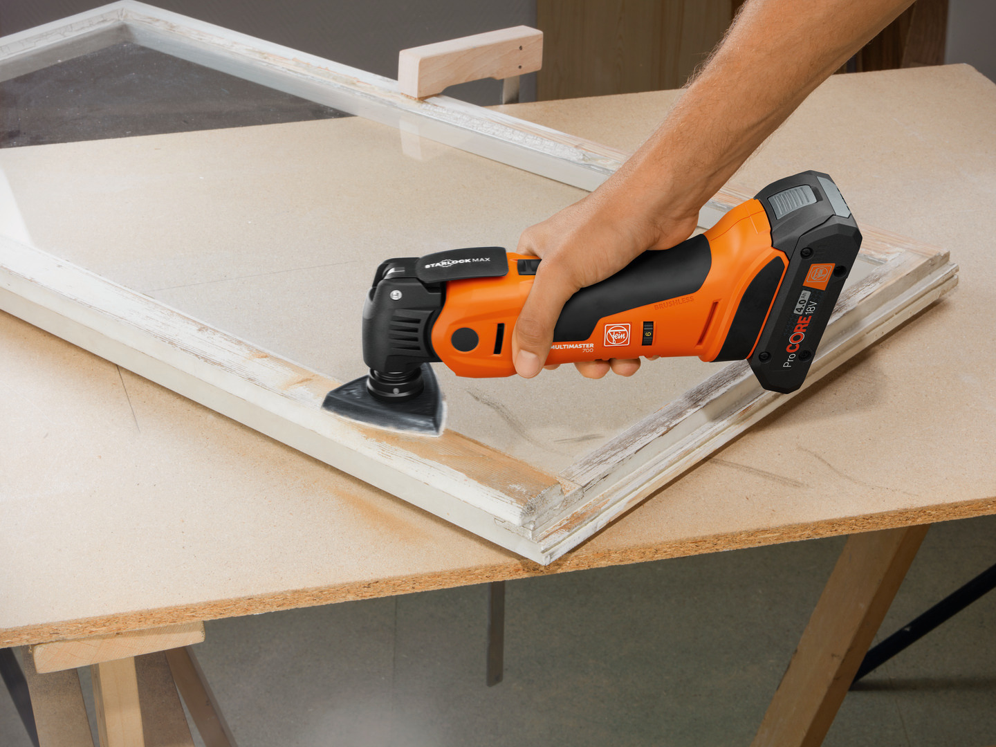 Machine oscillante sans fil FEIN - AMM 700 MAX AMPShare. Le plus puissant et performant des multitools sans fil FEIN avec interface de batterie 18 V AMPShare. Livré avec 2 lames E cut (221 et 205), 1 patin de ponçage, 15 feuilles abrasives ( 5* 60, 80, 120), 1 chargeur rapide et une batterie Li-ion 18V / 4 Ah
