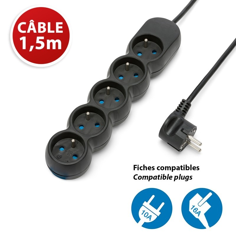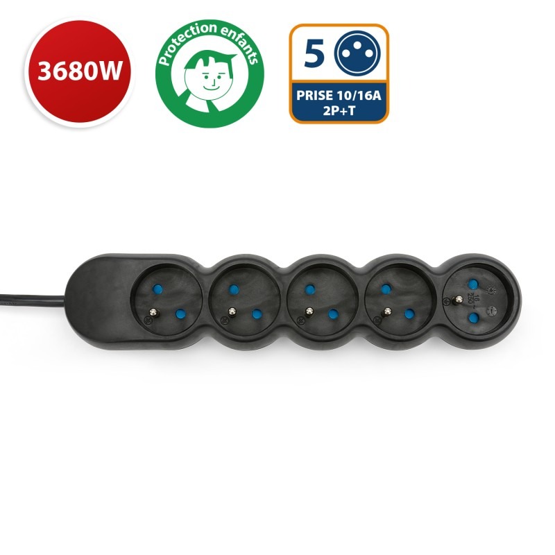 Multiprise 5 prises 16A avec protection enfant - câble 1,5m - VELAMP - MULTIP-FR-5K