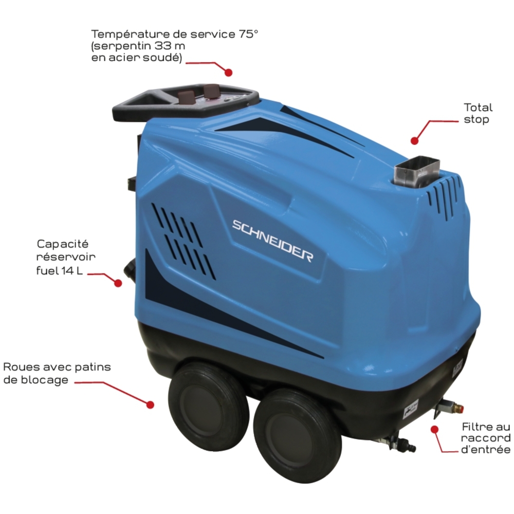 Nettoyeur HP eau chaude 380V 15 l/min 200 bar avec flexible 10m et total stop SCHNEIDER NHP - 50095