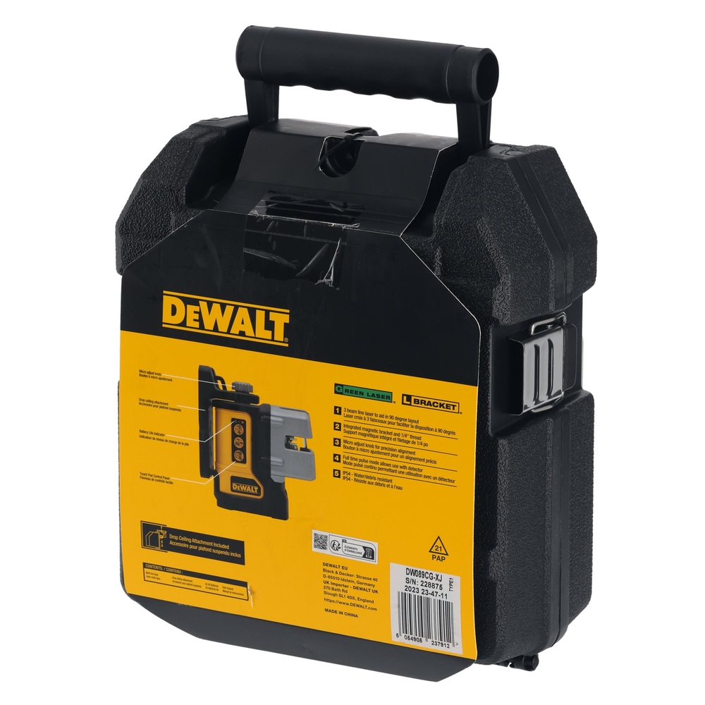 Le DW089CG-XJ se distingue par sa précision de +/- 3 mm à 10 mètres et l'intensité de ses faisceaux verts, qui sont jusqu'à quatre fois plus lumineux que les classiques faisceaux rouges, garantissant une visibilité optimale dans des environnements intérieurs. Son indice de protection IP54 assure une résistance à l'eau et à la poussière, tandis que le boitier en caoutchouc surmoulé protège l'appareil dans des conditions de travail difficiles. De plus, il comprend une base pivotante magnétique avec un filetage de ¼” pour faciliter l'installation. Le produit est livré avec un support magnétique, un coffret de transport et des piles alcalines AA.