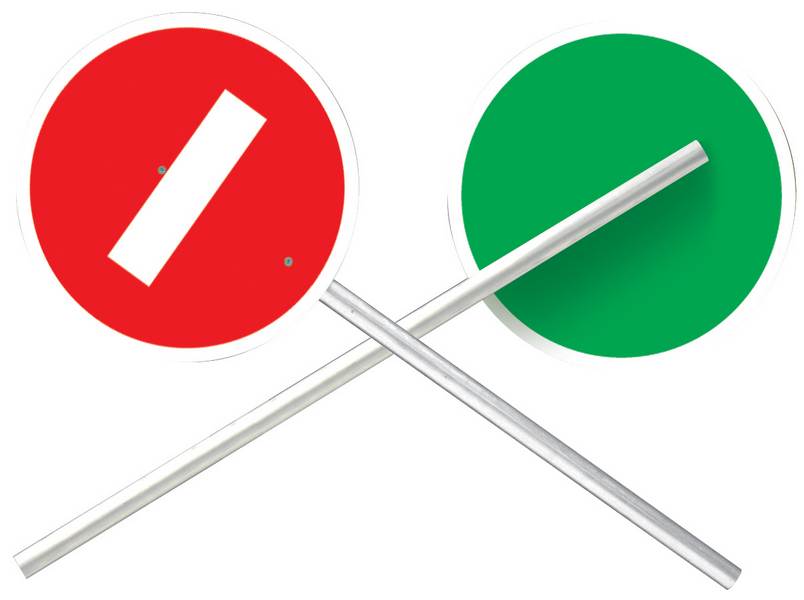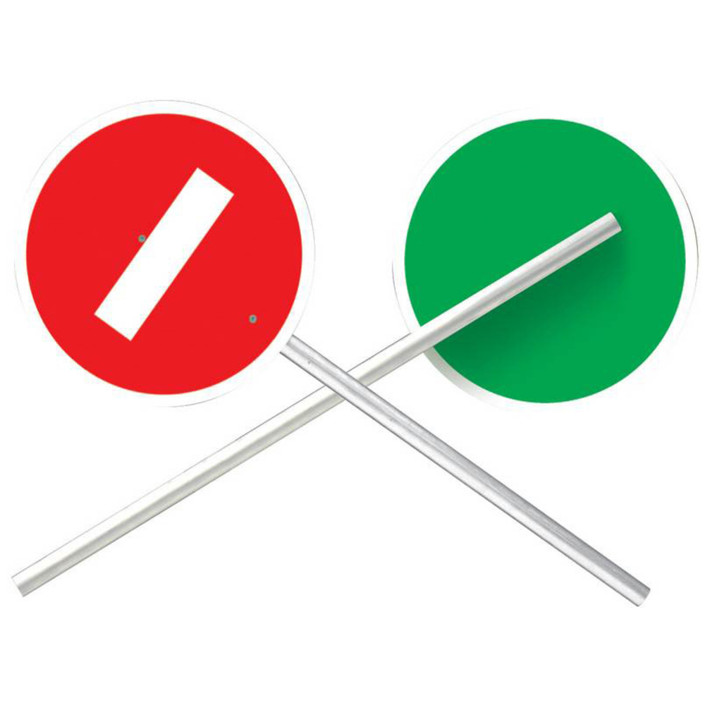 Disque en ps-choc, faces rétroréfléchissantes sérigraphiées, 1 côté vert “passage autorisé”, 1 côté rouge “sens interdit”, pour alternance manuelle de la circulation sur chantier. Manche aluminium longueur 700 mm pour Ø 320 mm et 1200 mm pour Ø 500 mm.