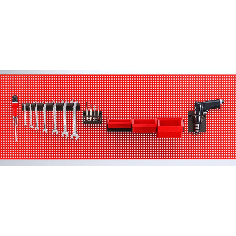 Ce panneau tôle permet de suspendre divers outils et équipements, optimisant ainsi l'espace de travail. Il est conçu pour s'intégrer facilement dans un environnement de bricolage ou professionnel, facilitant l'accès rapide à vos outils.