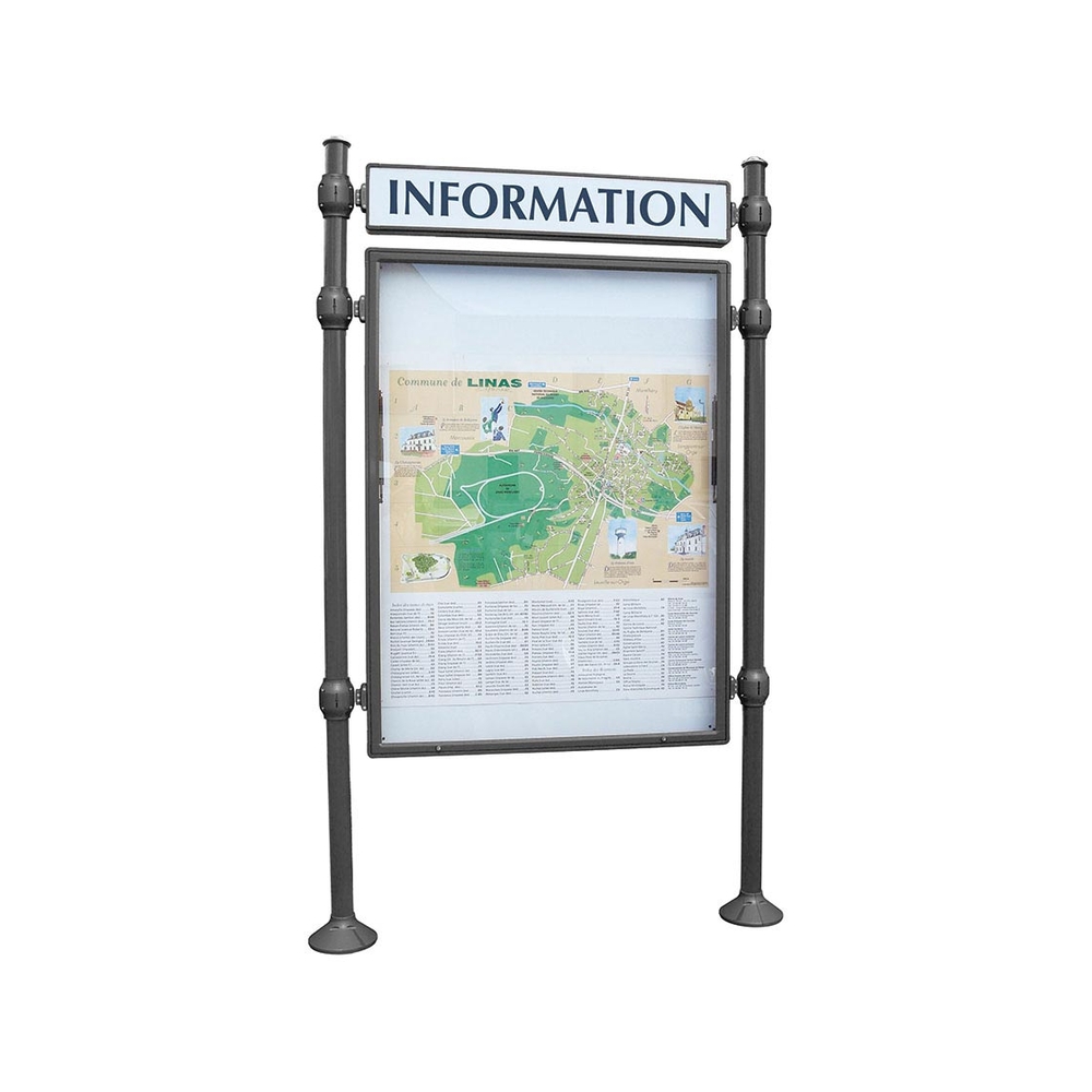 Adaptable en hauteur, le panneau peut atteindre 2700 mm avec son bandeau-titre, qui peut être personnalisé pour afficher différents types d'informations. La fixation des poteaux en acier et l'embase décorative en aluminium moulé assurent une stabilité optimale lors de la pose. Accessible en plusieurs coloris, le panneau Agora allie esthétique et fonctionnalité pour un usage extérieur en toute simplicité.