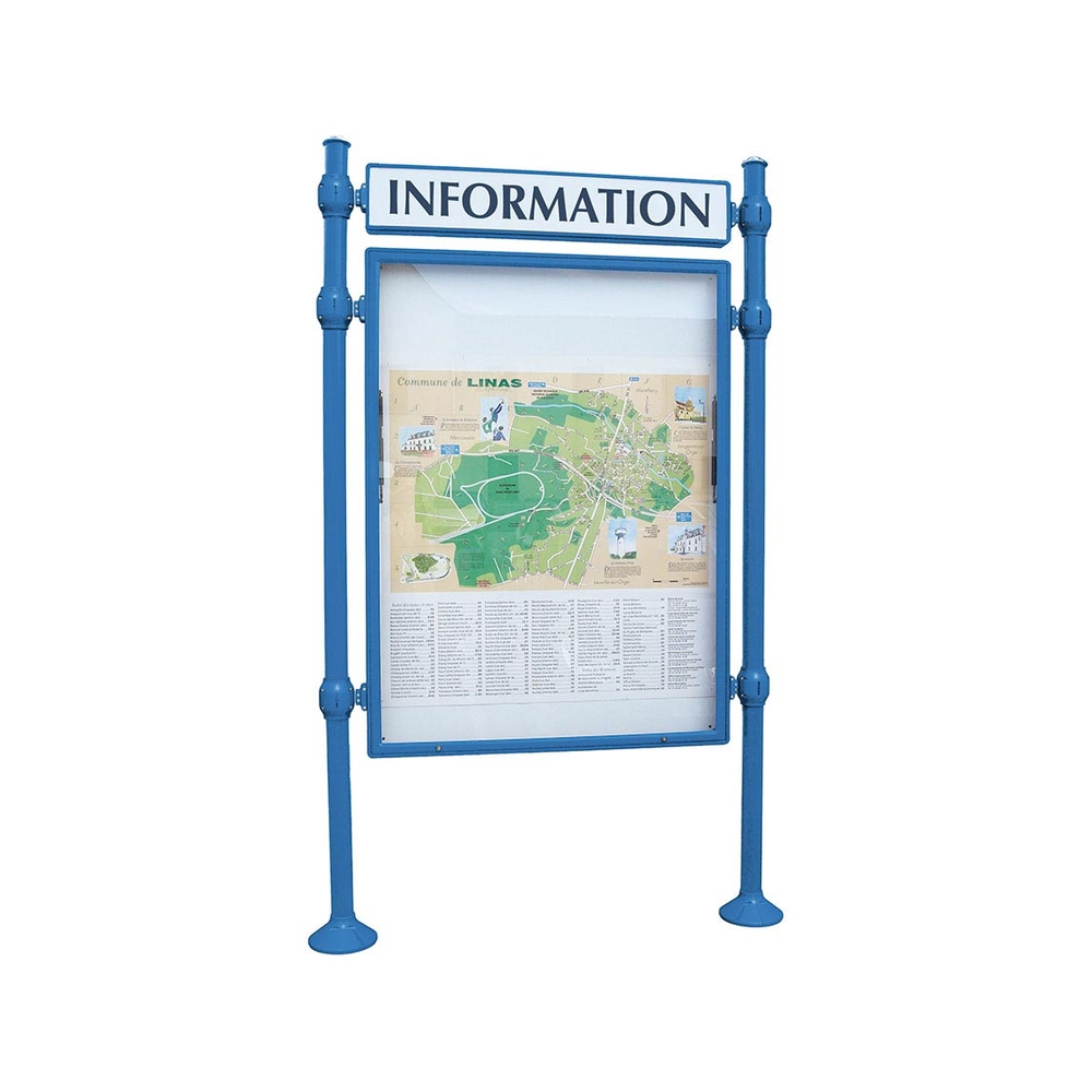 Doté d’une vitrine fermée, ce panneau permet un affichage simple ou double face, pouvant accueillir de 12 à 24 A4. Muni d’un système d’ouverture avec porte battante ou levante assistée par vérins, il assure un accès facile et sécurisé aux utilisateurs. Il est recommandé de le sceller directement pour une stabilité optimale.