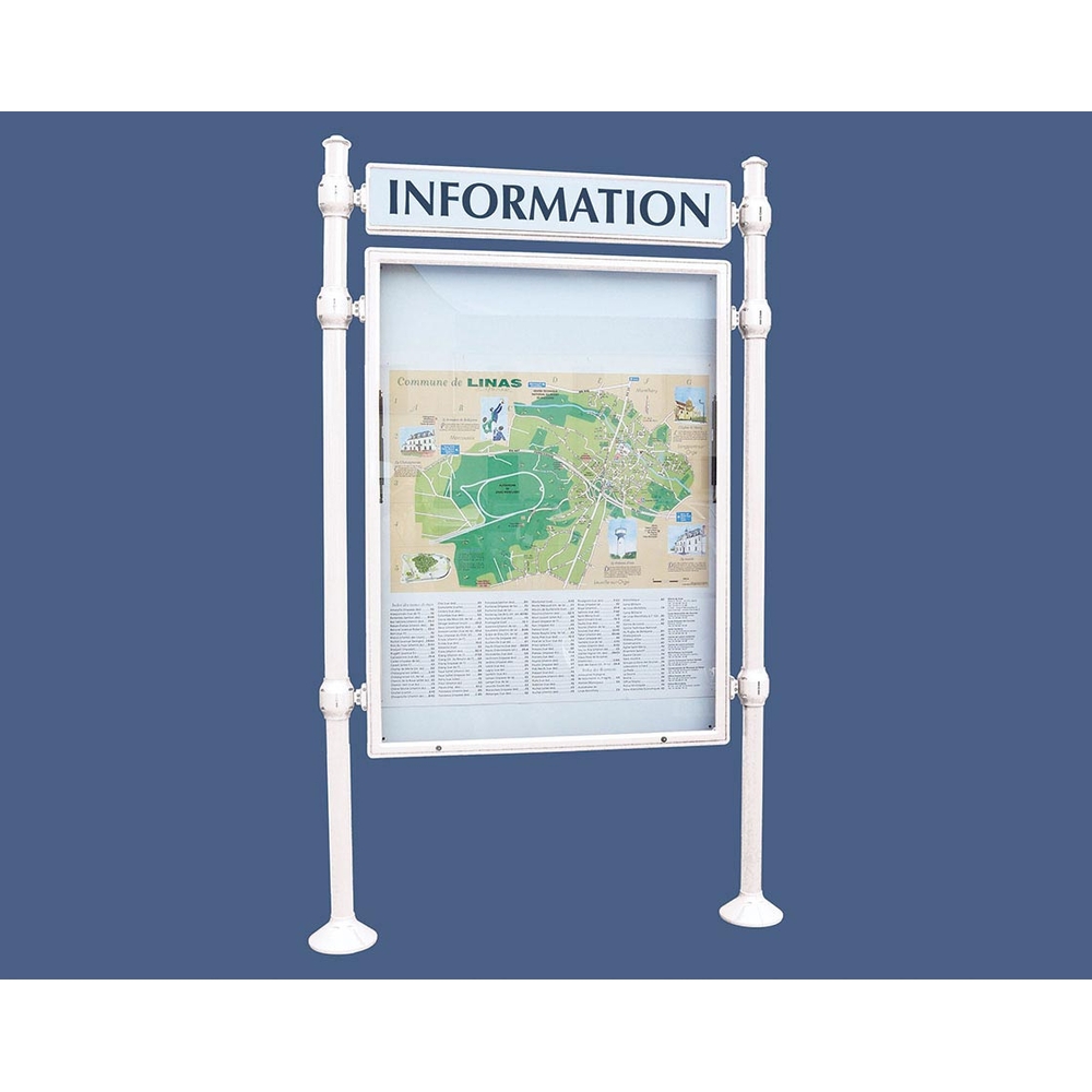 Mesurant H 1600 x 1200 mm, le panneau est constitué d'un cadre en aluminium de 75 mm d'épaisseur avec des angles arrondis, et d'un fond en tôle galvanisée laquée blanche. Sa hauteur hors sol est de 2500 ou 2700 mm avec bandeau-titre. Les poteaux en acier de diamètre 76 mm sont fixés avec des colliers en aluminium moulé, permettant des extensions ou des compositions à 90°. Le bandeau-titre de 75 mm d'épaisseur peut être personnalisé, avec des options de texte disponibles, et peut avoir une finition monochrome ou bicolore selon vos préférences. Le montage se fait par scellement direct.