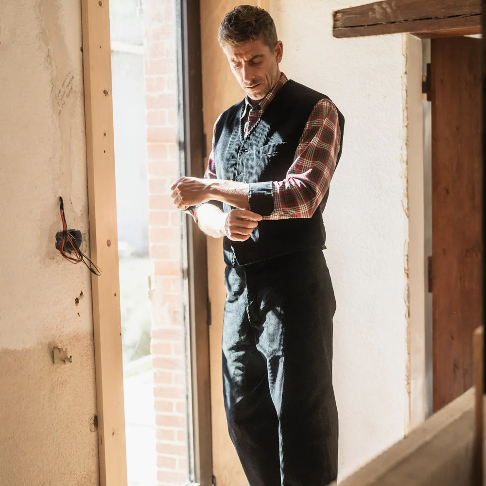 Ce modèle se distingue par sa ceinture droite fermée par un crochet acier complété d’un bouton, sa braguette boutonnée ainsi que par ses bas de jambes renforcés par un biais en cuir. Fonctionnel, il dispose d’une poche gousset, de poches italiennes, d’une poche mètre et d’une poche revolver, offrant des rangements pratiques et accessibles. Proposé avec deux longueurs d’entrejambe, il permet un ajustement adapté à chaque morphologie.