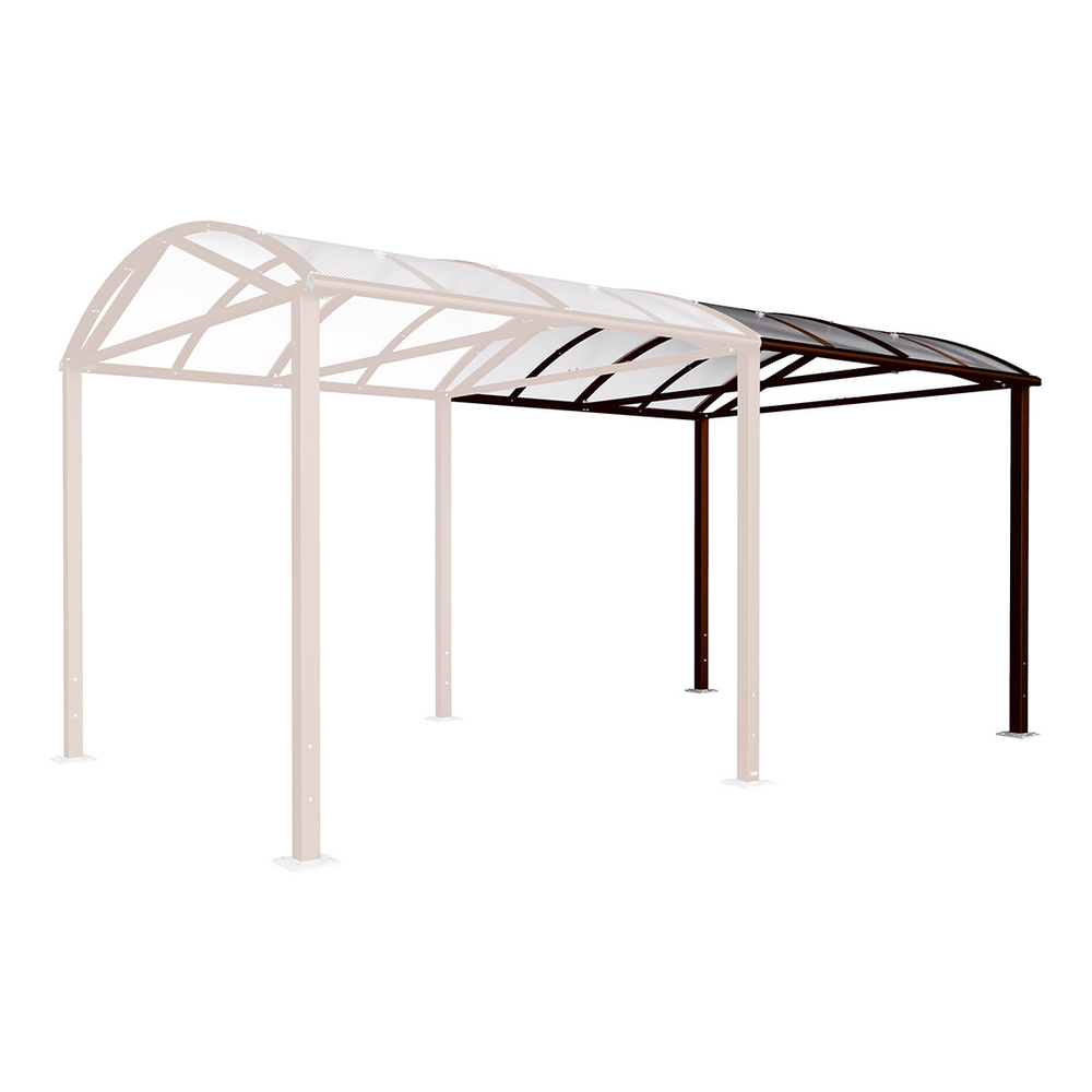 La structure repose sur des poteaux en acier galvanisé de section carrée 80 x 80 mm, assurant robustesse et durabilité. La toiture est constituée de traverses en aluminium de 60 x 40 mm, complétées par des gouttières en aluminium peint selon différents coloris, dont l'aspect Corten. La voûte est réalisée en polycarbonate alvéolaire de 10 mm d’épaisseur, traité anti-UV pour une résistance accrue aux rayons solaires et une longue durée de vie.