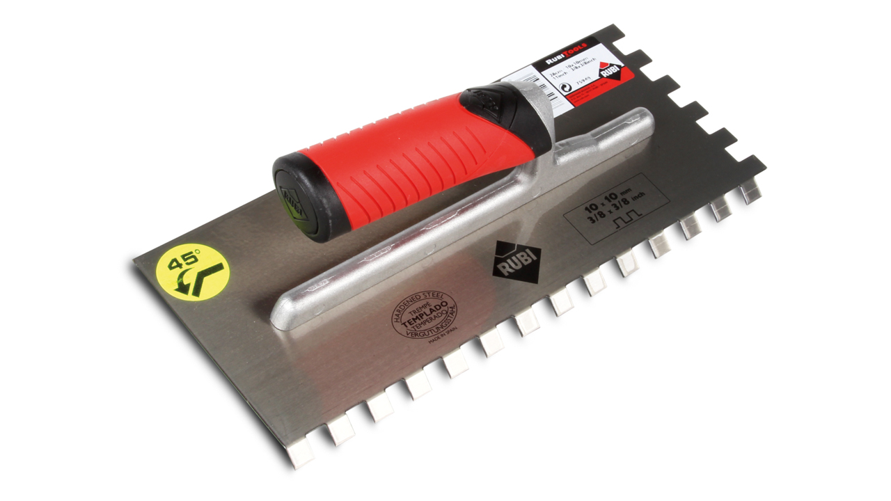 Équipé d'une denture inclinée à 45°, ce peigne assure une meilleure ergonomie, permettant de travailler avec un moindre effort. Les dimensions de la denture, avec une hauteur et une largeur de 10 mm, favorisent une adhérence parfaite du mortier colle, résultant en une finition soignée et durable des surfaces carrelées. Sa plaquette en acier au carbone de haute résistance à l'usure offre une longévité accrue, tandis que l'axe en aluminium léger et robuste contribue à une maniabilité optimale. La poignée ergonomique RUBIFLEX se distingue par ses deux textures qui améliorent la prise en main, rendant l'outil agréable à utiliser sur de longues périodes. Un vernis transparent protège le peigne contre la corrosion, garantissant ainsi une utilisation prolongée dans des conditions variées.