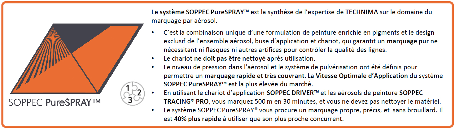 • Utilisée avec le chariot SOPPEC DRIVER™, la peinture SOPPEC TRACING PRO™ procure débit et couvrant optimum pour une vitesse d’application de 1,2 km/h (ou 10 m en 30 secondes ). Comme elle sèche très rapidement, cela en fait le système de traçage de lignes par aérosol le plus rapide du marché , pour une application nette et sans besoin de nettoyer le chariot.