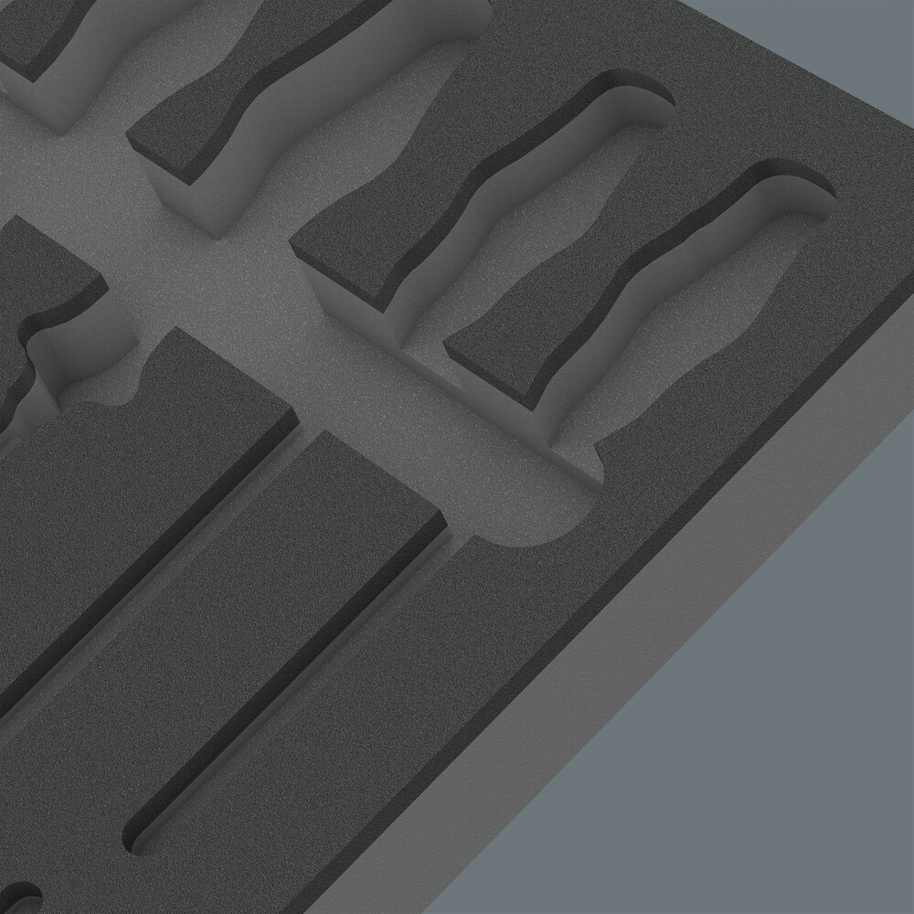 1 insert en mousse durable, sans outils ; bicolore pour repérer rapidement les pièces manquantes ; largeur x hauteur x profondeur : 344 x 30 x 392 mm ; insert en mousse de rechange pour article Wera 9710 ; compatible avec la servante d'atelier Tool Rebel.
