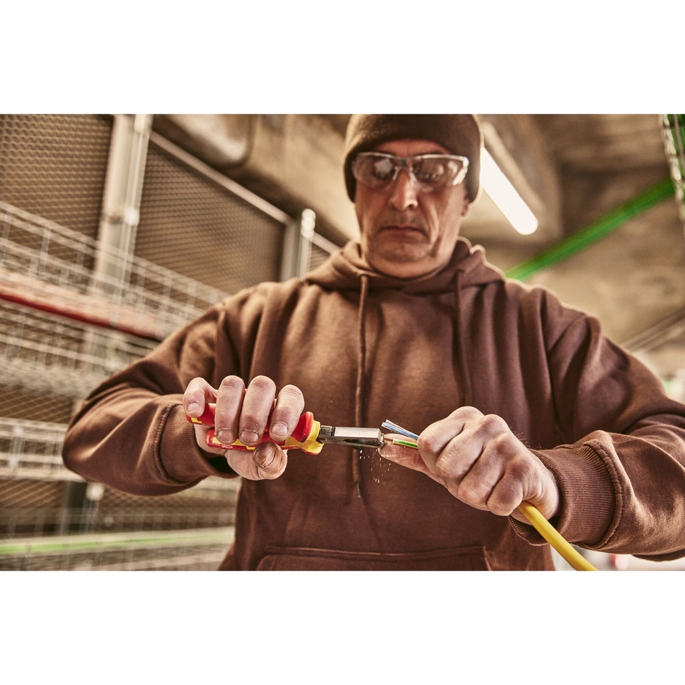 Cette pince est conçue pour dénuder avec précision les fils multi et monobrins allant de 0,75 à 6 mm². Grâce à son articulation fluide, elle permet une coupe régulière, assurant ainsi un travail rapide et efficace sous tension. Les poignées bi-matière offrent une excellente prise en main et un confort optimal pendant l'utilisation.