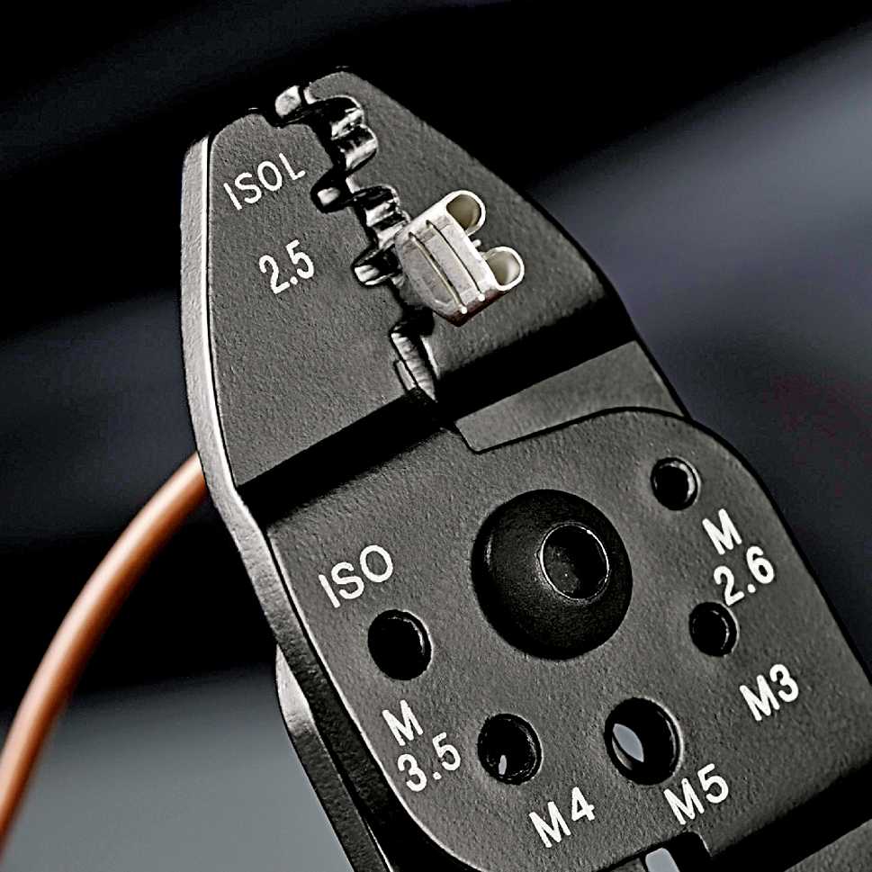 Pour couper et dénuder les câbles et pour sertir les cosses et les connecteurs isolés, non isolés et les connecteurs ouverts. Avec trous filetés pour la coupe de tiges filetées en cuivre ou en laiton M 2,6. M 3. M 3,5. M 4 et M 5. Plus de stabilité et mouvement sans à-coups grâce à la charnière vissée. Acier spécial, haute résistance.