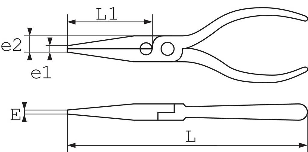 Ses dimensions sont les suivantes : longueur totale de 280 mm, largeur du bec (E) de 9 mm, largeur aux extrémités e1 de 10 mm et e2 de 9 mm, largeur L' de 11 mm. La pince pèse 270 grammes, ce qui lui confère une bonne maniabilité. Elle est adaptée aux travaux d’électronique, de mécanique et autres applications nécessitant un accès précis dans des espaces restreints.