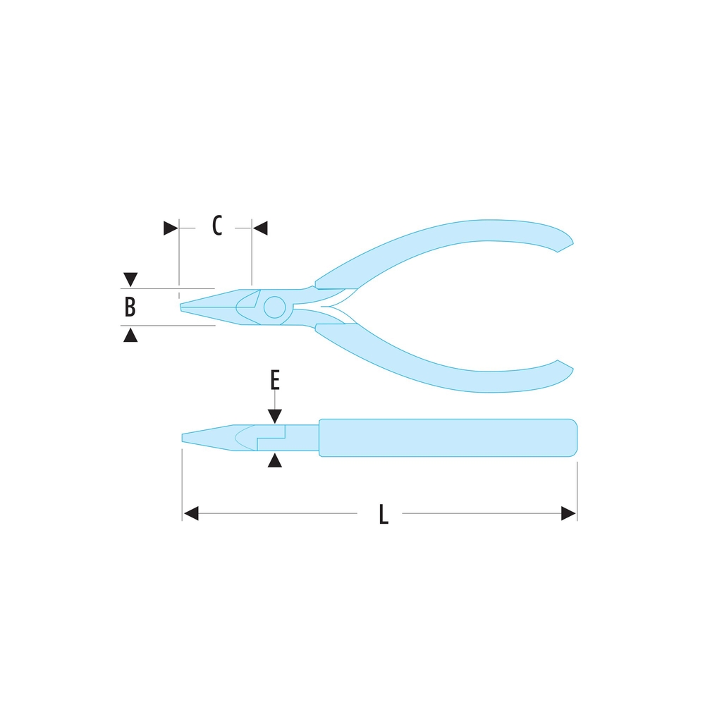 Cette pince se distingue par ses becs courts adaptés pour un travail de précision. Les références disponibles incluent le modèle CM.EL35, qui est livré sans contenant, et les modèles 2138.EL35 et BPC24N.EL35, respectivement fournis avec un coffret BV.21ST et une boîte à outils en plastique BP.C24N. Chaque outil a été conçu pour offrir une durabilité accrue et un confort d'utilisation optimal.