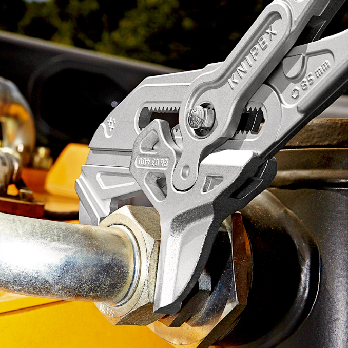 L'outil de montage unique en son genre désormais disponible en longueur de 400 mm. Capacité jusqu'à 85 mm ou 3 3/8'. Convient aussi parfaitement pour saisir, tenir, presser et mettre en forme. Adaptation optimale à la pièce tout en maintenant une position commode des poignées. Encliquetage sûr de l'axe d'articulation: pas de déréglage accidentel. Force de serrage élevée grâce à une transmission de force manuelle multipliée par 10. Outil de vissage réglable. Remplace diverses grandes clés coûteuses allant jusqu'à 85 mm ou 3 3/8'. Saisie sans à-coup de toutes les largeurs jusqu'à la capacité maximale indiquée grâce à ses mâchoires parallèles. Mâchoires lisses, permettant de réaliser, en les ménageant, des assemblages vissés de haute qualité en laiton, bronze ou inox. Pas d'endommagement des bords des robinetteries chromées grâce à une pression des mâchoires sans jeu. La course entre les mâchoires permet un serrage et un desserrage rapide selon le principe du cliquet. Réglage à même la pièce par simple pression du bouton. Acier électrique au chrome-vanadium, forgé, trempé à l'huile.
