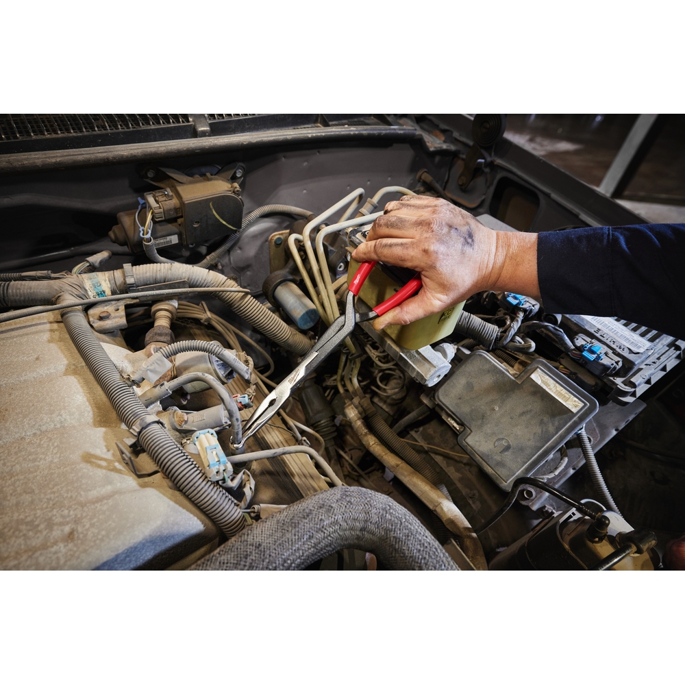 Découvrez ce set de pinces pour bougie MILWAUKEE, conçu pour offrir un accès optimal dans les espaces restreints. Grâce à leurs poignées croisées à longue portée, ces pinces facilitent la saisie de divers matériaux comme les vis, câbles et pièces rondes.