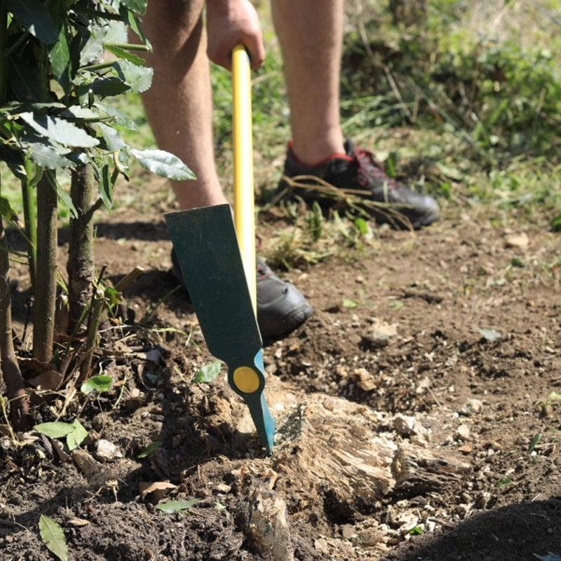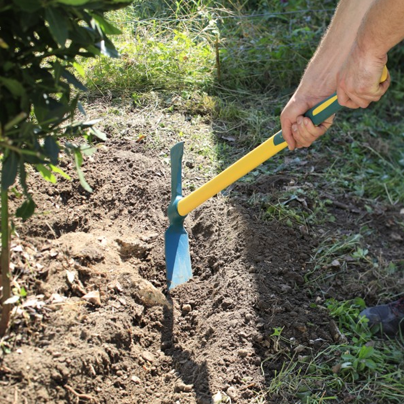 - 2-en-1 : 1 côté panne pour creuser et racler et 1 côté hache pour couper les racines