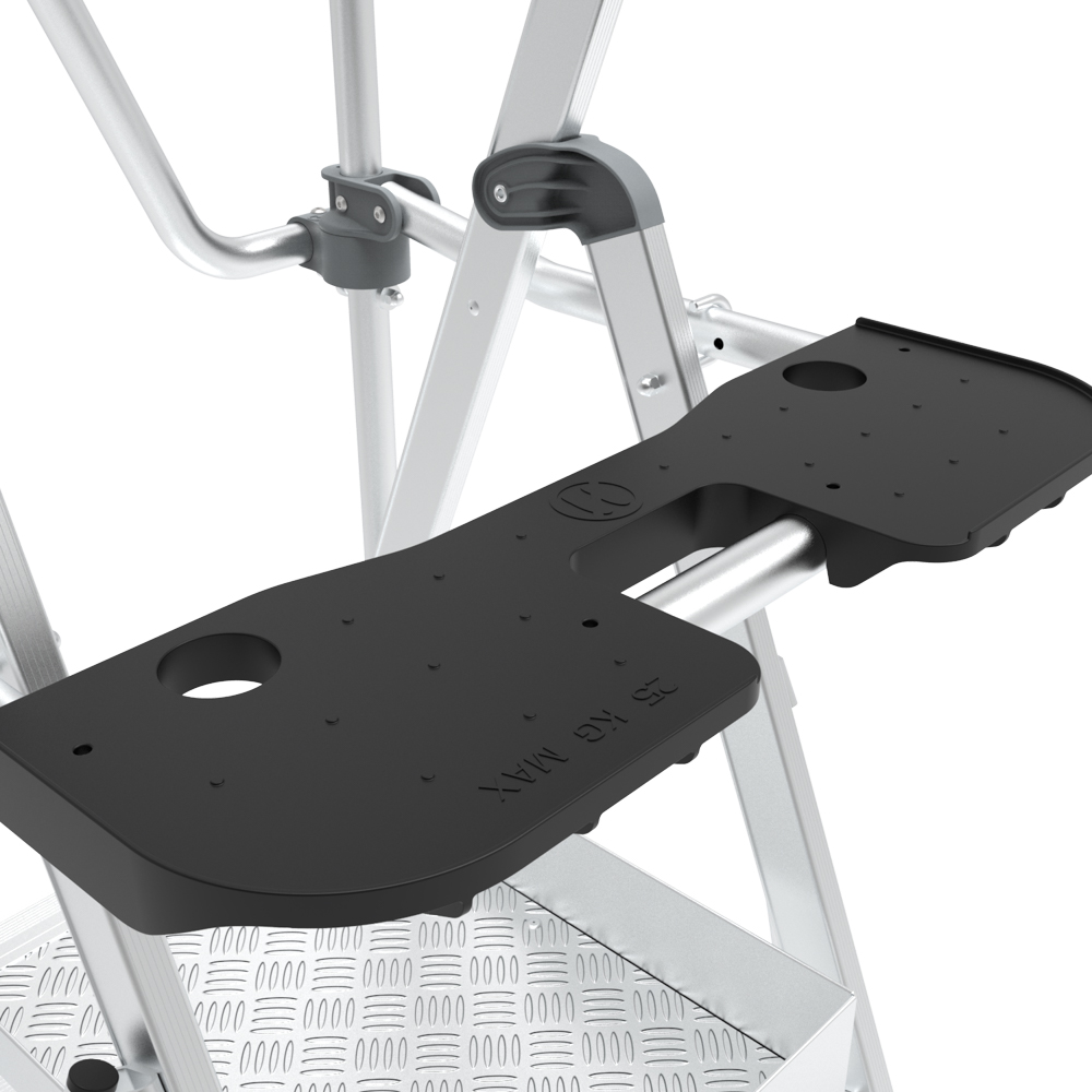 - Porte-outils compartimenté amovible avec une résistance de 25 kg et crochets intégrés supportant jusqu’à 10 kg.