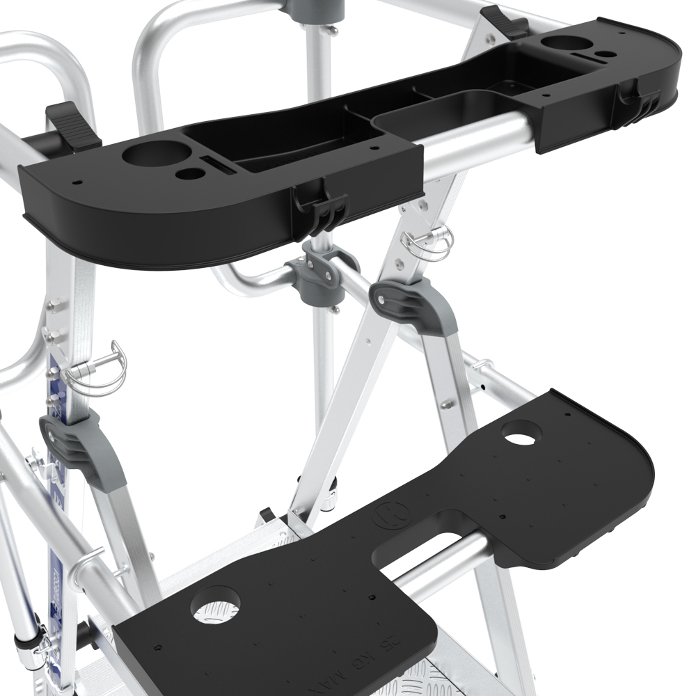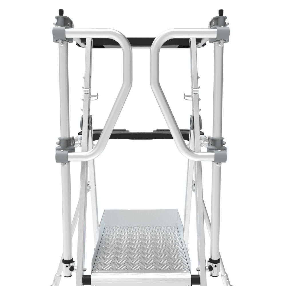 La plateforme SHERPASCOPIC PLIANT - GARDE-CORPS SALOON est conçue pour garantir confort et sécurité. Elle est dotée d’un porte-outils compartimenté amovible supportant jusqu’à 25 kg, avec crochets intégrés (capacité 10 kg) pour un accès rapide à vos équipements. Une tablette XL, résistante à 25 kg, ajoute un espace de rangement pratique.