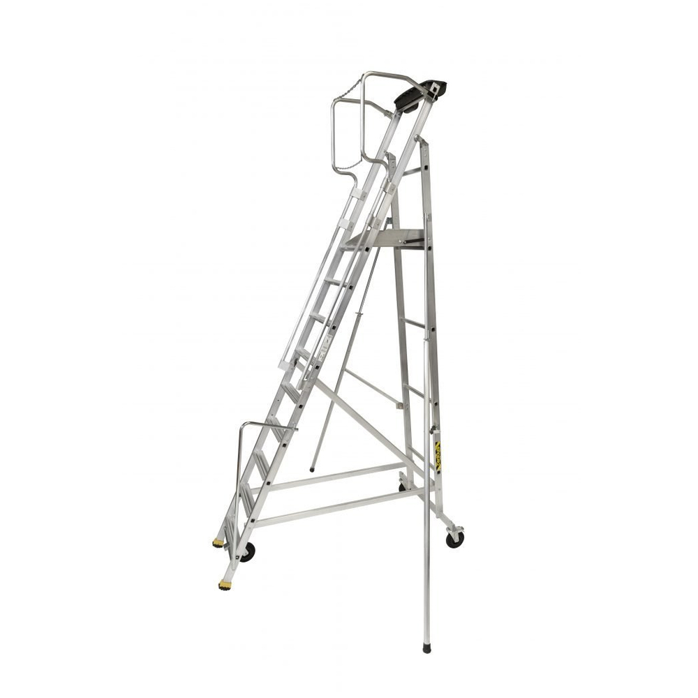 Equipées de stabilisateurs à réglage millimétrique, les plates-formes en aluminium garantissent un accès sécurisé aux rayonnages, racks de stockage et machines. L'accès au plancher se fait par de larges antidérapantes de 80 mm de largeur, assemblées par sertissage sur les modèles 4 à 9 marches et par soudage à partir du 10 marches.