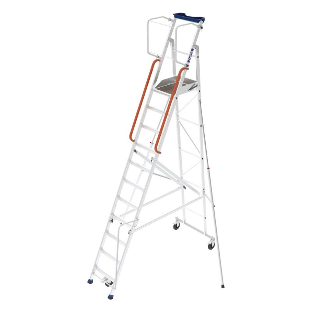 Equipées de stabilisateurs à réglage millimétrique, les plates-formes en aluminium garantissent un accès sécurisé aux rayonnages, racks de stockage et machines. L'accès au plancher se fait par de larges antidérapantes de 80 mm de largeur, assemblées par sertissage sur les modèles 4 à 9 marches et par soudage à partir du 10 marches.