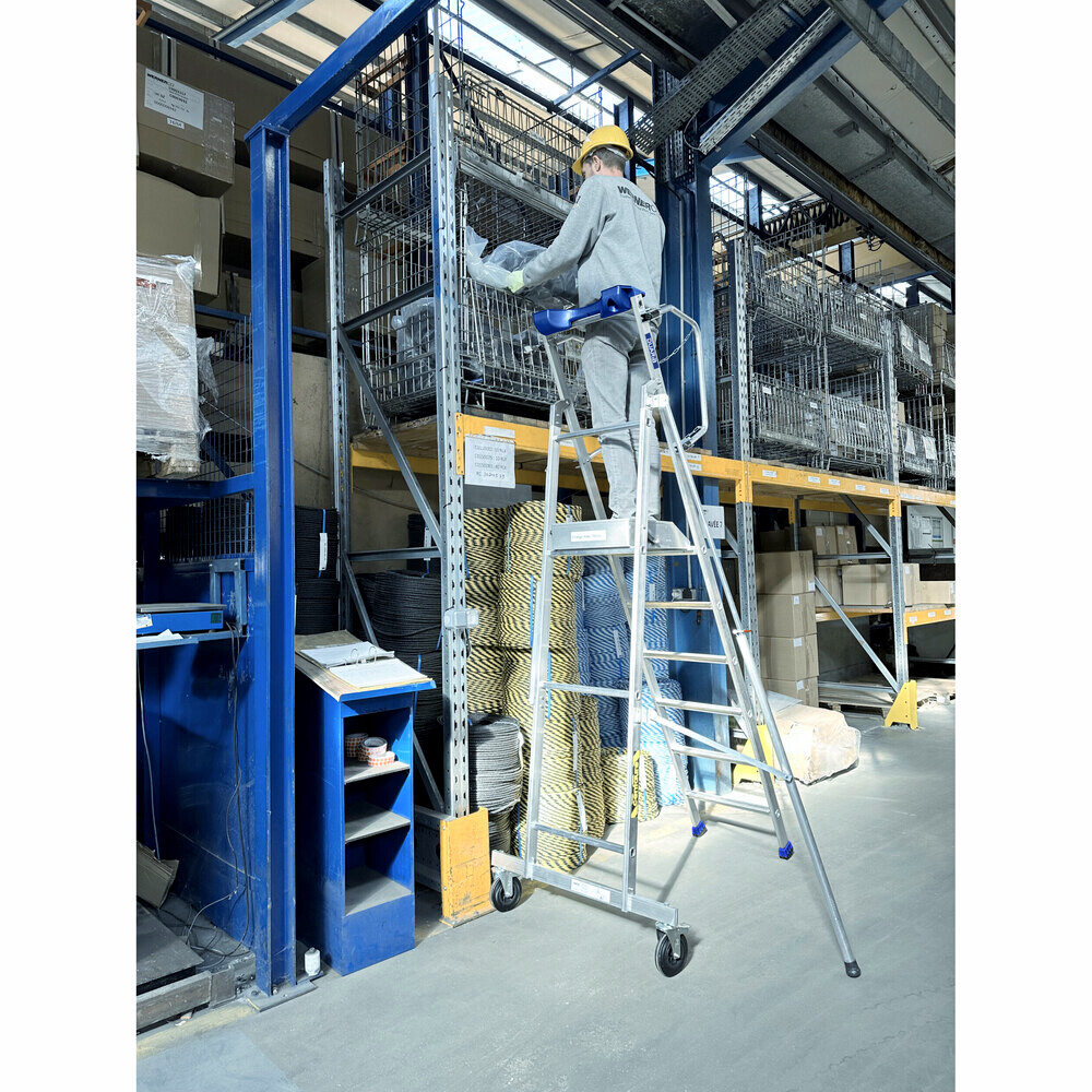 Equipées de stabilisateurs à réglage millimétrique, les plates-formes en aluminium garantissent un accès sécurisé aux rayonnages, racks de stockage et machines. L'accès au plancher se fait par de larges antidérapantes de 80 mm de largeur, assemblées par sertissage sur les modèles 4 à 9 marches et par soudage à partir du 10 marches.