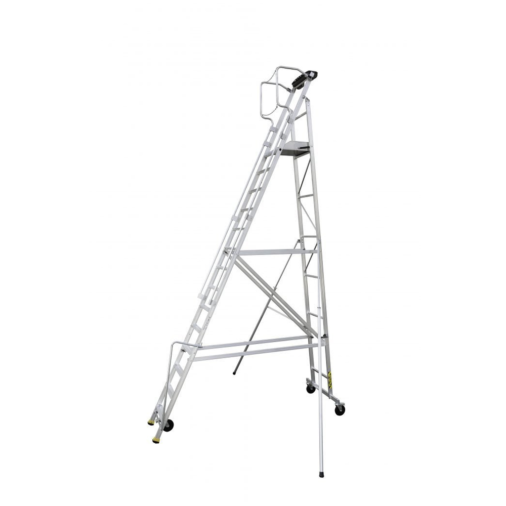 Equipées de stabilisateurs à réglage millimétrique, les plates-formes en aluminium garantissent un accès sécurisé aux rayonnages, racks de stockage et machines. L'accès au plancher se fait par de larges antidérapantes de 80 mm de largeur, assemblées par sertissage sur les modèles 4 à 9 marches et par soudage à partir du 10 marches.