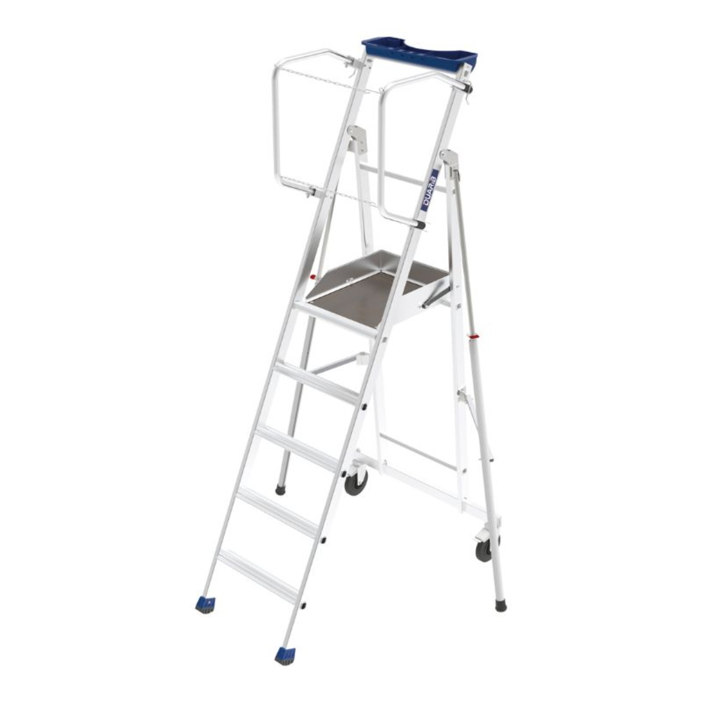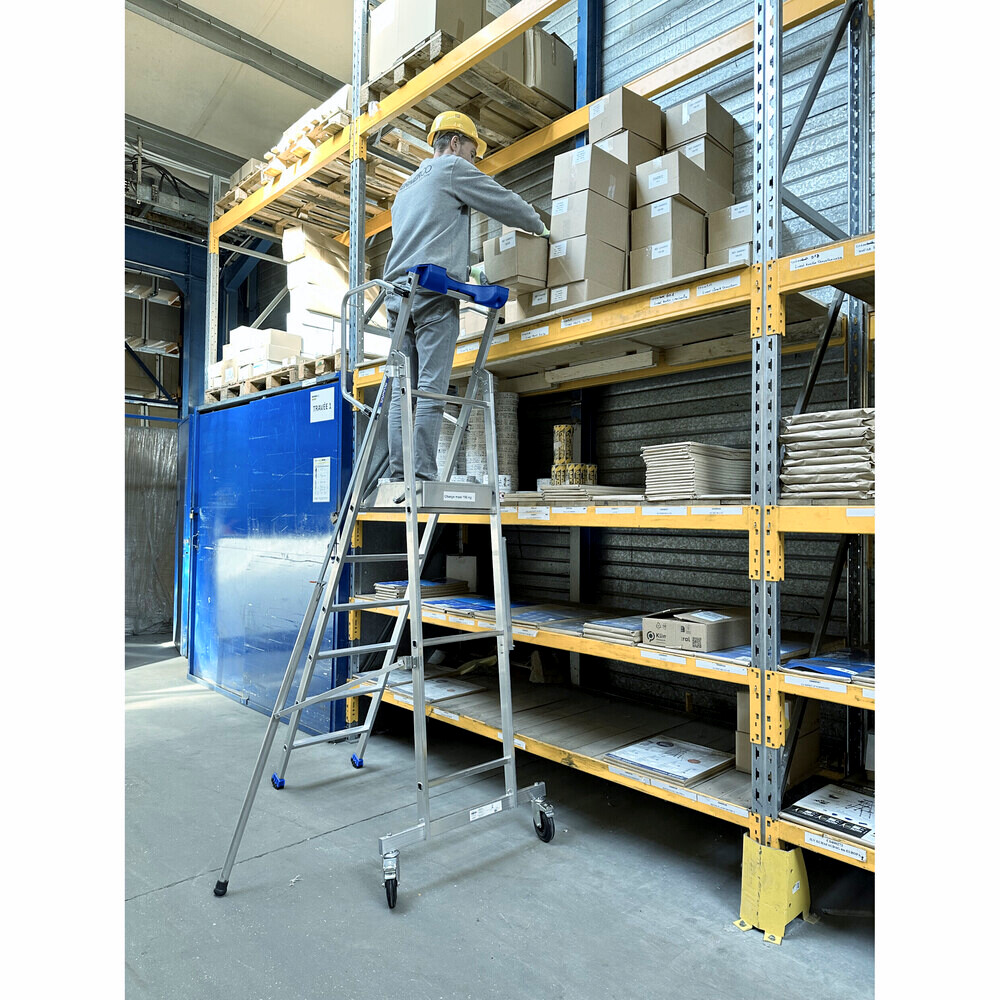 Equipées de stabilisateurs à réglage millimétrique, les plates-formes en aluminium garantissent un accès sécurisé aux rayonnages, racks de stockage et machines. L'accès au plancher se fait par de larges antidérapantes de 80 mm de largeur, assemblées par sertissage sur les modèles 4 à 9 marches et par soudage à partir du 10 marches.