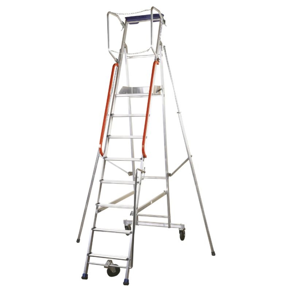 Equipées de stabilisateurs à réglage millimétrique, les plates-formes en aluminium garantissent un accès sécurisé aux rayonnages, racks de stockage et machines. L'accès au plancher se fait par de larges antidérapantes de 80 mm de largeur, assemblées par sertissage sur les modèles 4 à 9 marches et par soudage à partir du 10 marches.