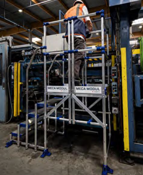 Plate-forme accès faible hauteur de la gamme Meca Modul. Une gamme de solutions standardisées adaptables à vos besoins spécifiques permettant de travailler, circuler et accéder en sécurité en milieu industriel. La plate-forme répond aux exigences de la norme EN 14 122.