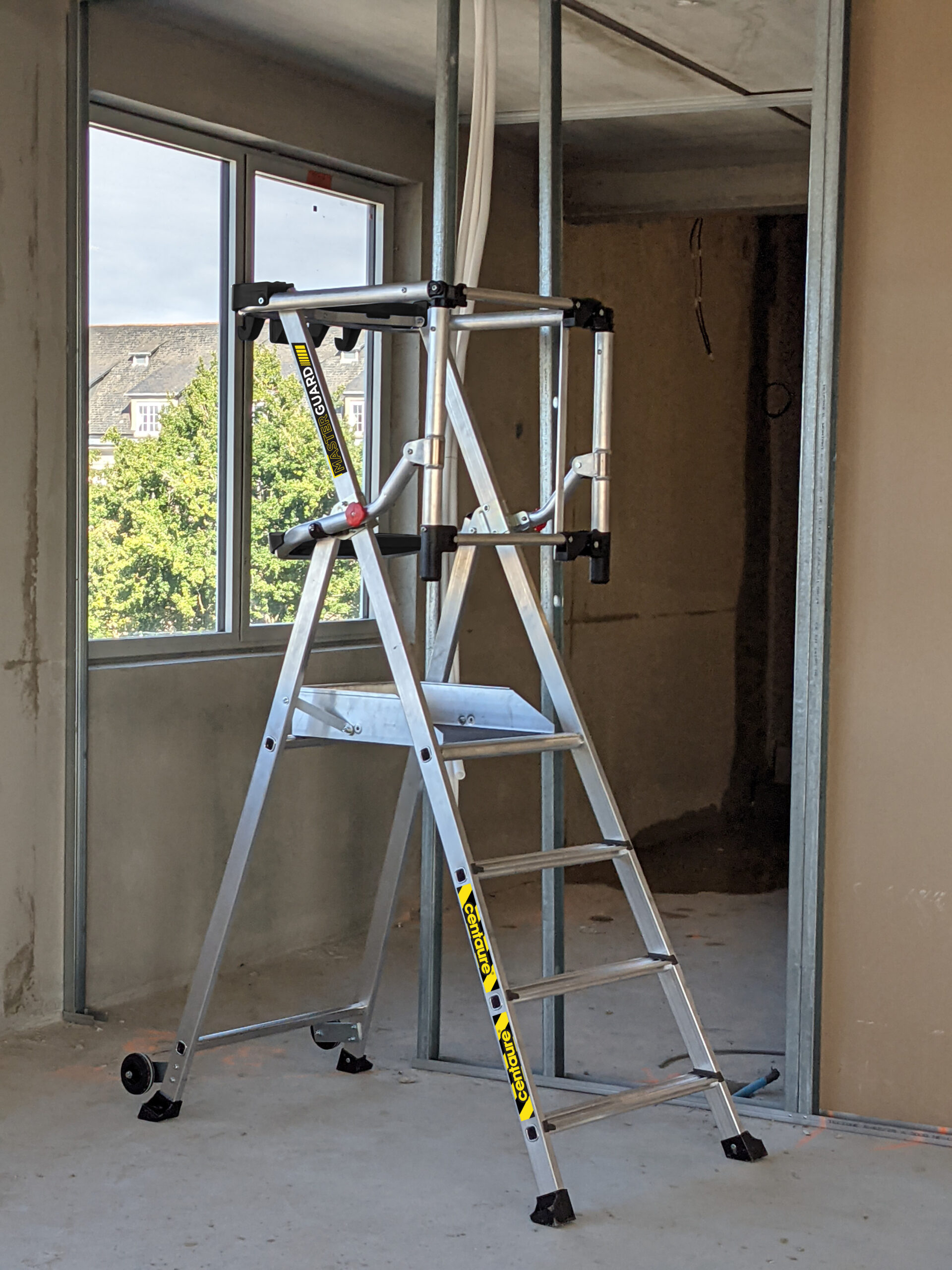 Le système de pantographe breveté à fermeture automatique permet d'accéder facilement et confortablement sur le plancher. Il permet également une protection 360° de l'opérateur. L'accès au plancher antidérapant (0,40 x 0,50 m) se fait par de larges marches antidérapantes de 80 mm. Les roues (diamètre 100 mm) facilitent les déplacements en position ouverte ou fermée sur les chantiers professionnels. Les déplacements sont également facilités grâce à sa poignée de transport.